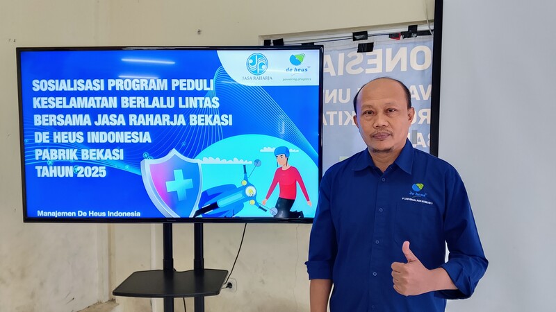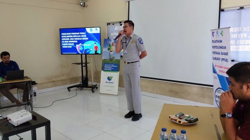 Manajemen De Heus yang diwakili oleh HRGA Lead, Marsan menyampaikan apresiasinya atas kepedulian Jasa Raharja Bekasi dalam mendukung kesehatan dan keselamatan lalu-lintas para pekerja.